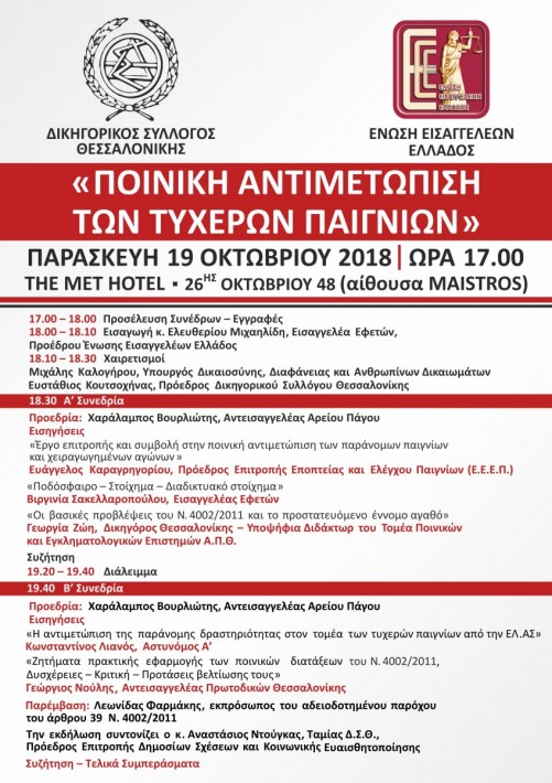 Επιστημονική εκδήλωση του Δ.Σ.Θεσσαλονίκης με θέμα «Ποινική αντιμετώπιση των τυχερών παιγνίων»